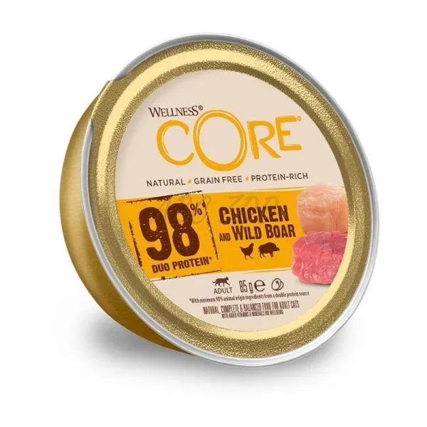 Wellness CORE 98% Duo Protein je kompletné krmivo s kuracím a diviačim mäsom, bez obilnín pre dospelé mačky s citlivým trávením.
