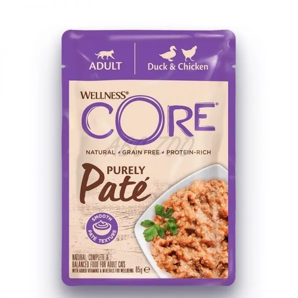 Wellness CORE Purely Paté je lahodná paštéta s kuracím a kačacím mäsom, bez obilnín pre dospelé mačky.