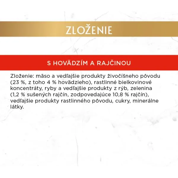 Zloženie: mäso a vedľajšie produkty živočíšneho pôvodu (z toho 4% hovädzieho), rastlinné bielkovinové koncentráty, zelenina (7% sušených rajčín), ryby a vedľajšie produkty z rýb, cukry, minerálne látky