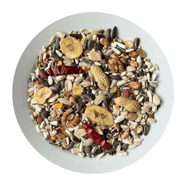 Zloženie: slnečnica biela, svetlice farbiarska, slnečnica žíhaná veľká, pohánka, banány, arašidy lúpané, ovos bezpluchý, hrachové vločky, tekvicové semená, paddy ryža, hrozienka, vlašské orechy, kukurica, extrudované granule s ovocím, pestrec mariánsky, kukuričné ​​vločky, cirok červený, cirok biely, sušená mrkva, ananás, papája, chilli papričky