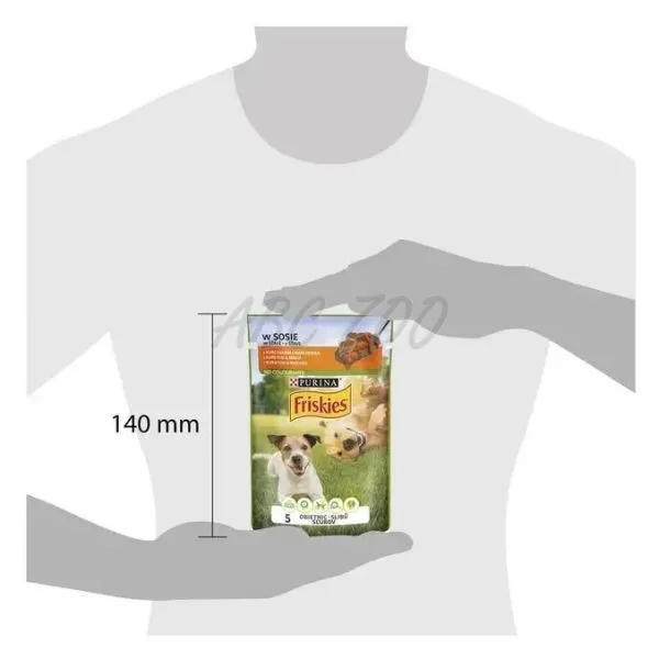 Lahodná kapsička Friskies je kompletné vlhké krmivo s kuraťom a mrkvou pre dospelé psy.