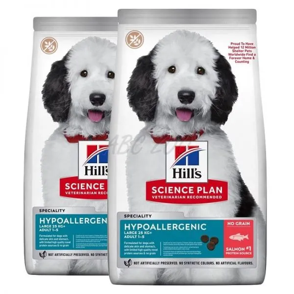Krmivo pre dospelé psy veľkých plemien Hill's Science Plan Hypoallergenic s lososom je suché krmivo s výbornou chuťou pre dospelé psy veľkých plemien vo veku 1 – 6 rokov. Toto chutné hypoalergénne suché krmivo pre psy s obmedzeným množstvom vysokokvalitných nových zdrojov bielkovín a bez obsahu obilnín je prispôsobené potrebám psov s precitlivenosťou.