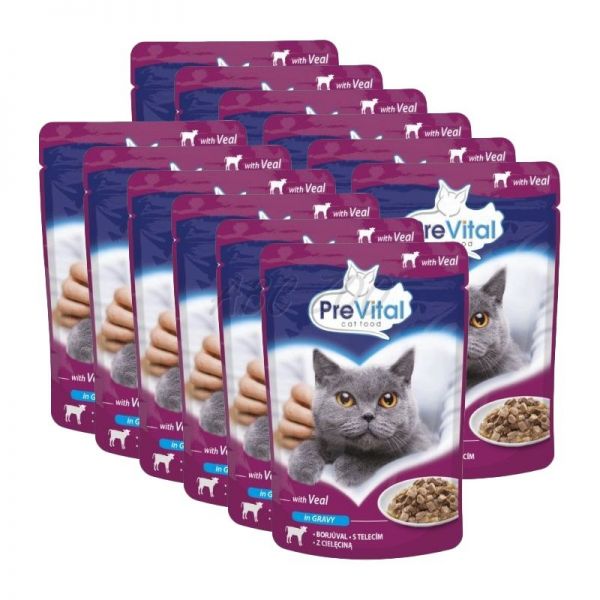 PreVital kapsička s teľacím mäsom v omáčke je kompletné a vyvážené krmivo pre dospelé mačky.