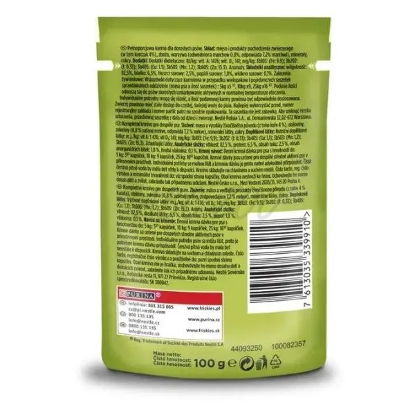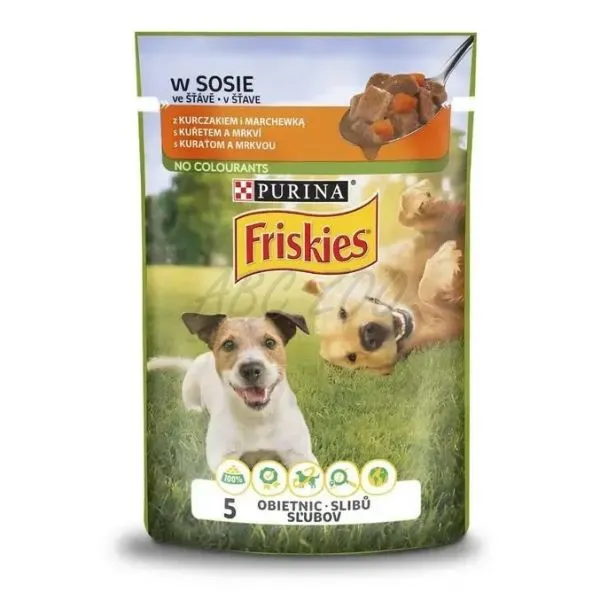 Lahodná kapsička Friskies je kompletné vlhké krmivo s kuraťom a mrkvou pre dospelé psy.