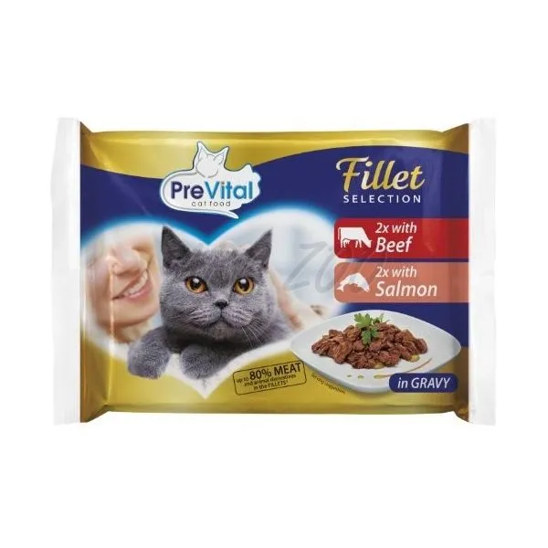 Prevital Fillet Selection kapsička s hovädzinou a lososom v omáčke je kompletné a vyvážené krmivo pre dospelé mačky.