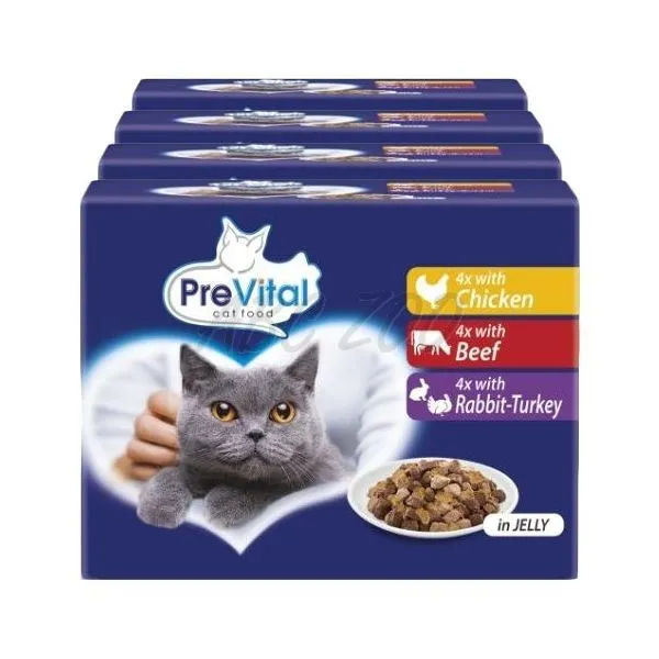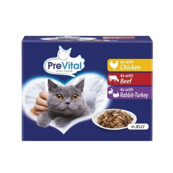 PreVital kapsička s kuracím, hovädzím mäsom a morkou s králikom v želé je kompletné a vyvážené krmivo pre dospelé mačky.