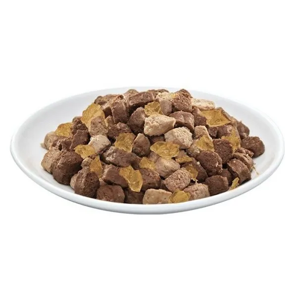 S HOVÄDZÍM: mäso a vedľajšie produkty živočíšneho pôvodu (4 % hovädzina), obilniny, rastlinné bielkovinové koncentráty, minerálne látky, cukry. Bez farbív a konzervačných látok.