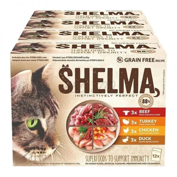 Shelma kapsička je kompletné krmivo bez obilnín pre dospelé mačky, bohaté na kuracie, hovädzie, morčacie a kačacie mäso.