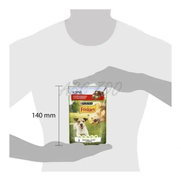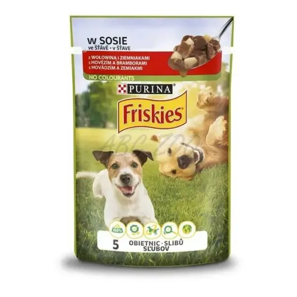 Lahodná kapsička Friskies je kompletné vlhké krmivo s hovädzím mäsom a zemiakmi pre dospelé psy.