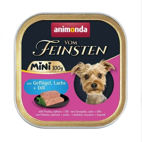 Animonda Vom Feinsten Mini vanička kombinuje jemnú hydinu s lososom a kôprom, pre dospelé psy (1-6 rokov) malých plemien.