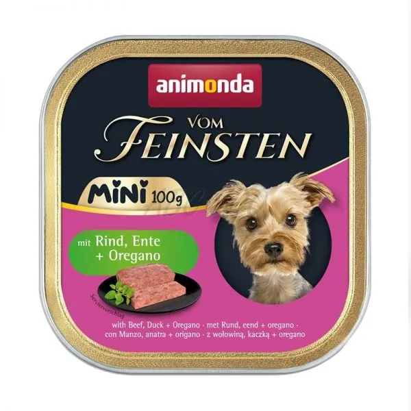 Animonda Vom Feinsten Mini vanička kombinuje hovädzie mäso s kačicou a oregánom, pre dospelé psy (1-6 rokov) malých plemien.