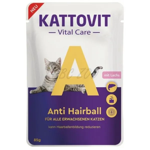 Kattovit Vital Care Anti Hairball kapsička je kompletné krmivo s lososom pre dospelé mačky, ktoré pomáha redukovať vznik bezoárov.