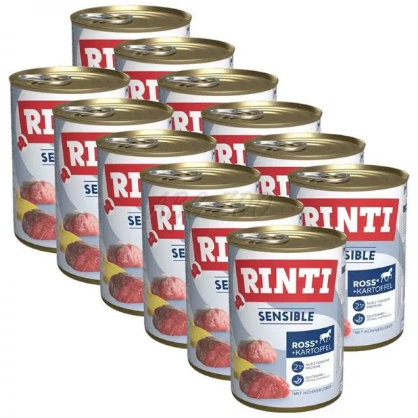 Rinti Sensible je kompletné krmivo s konským mäsom, kuracou pečeňou a zemiakmi, pre dospelé psy všetkých plemien s citlivým trávením.
