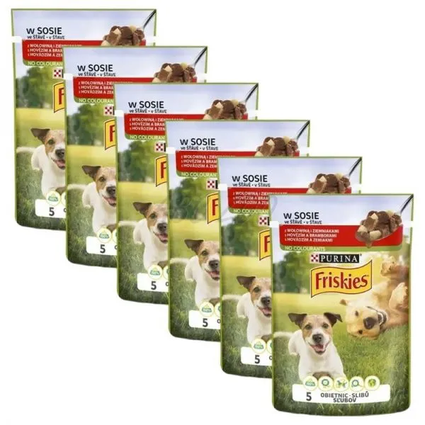 Lahodná kapsička Friskies je kompletné vlhké krmivo s hovädzím mäsom a zemiakmi pre dospelé psy.