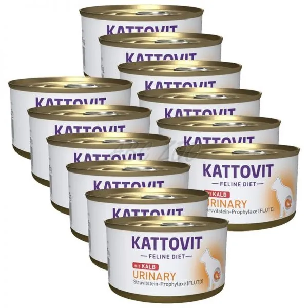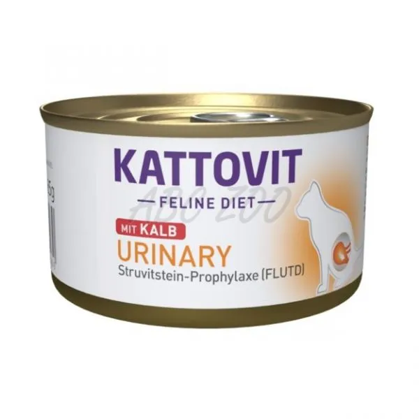 Kattovit Urinary konzerva je určená pre mačky s FLUTD (Feline Lower Urinary Tract Disease) problémami s dolnými močovými cestami a na zníženie výskytu struvitových kameňov – s príchuťou teľacieho mäsa.