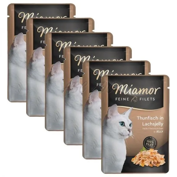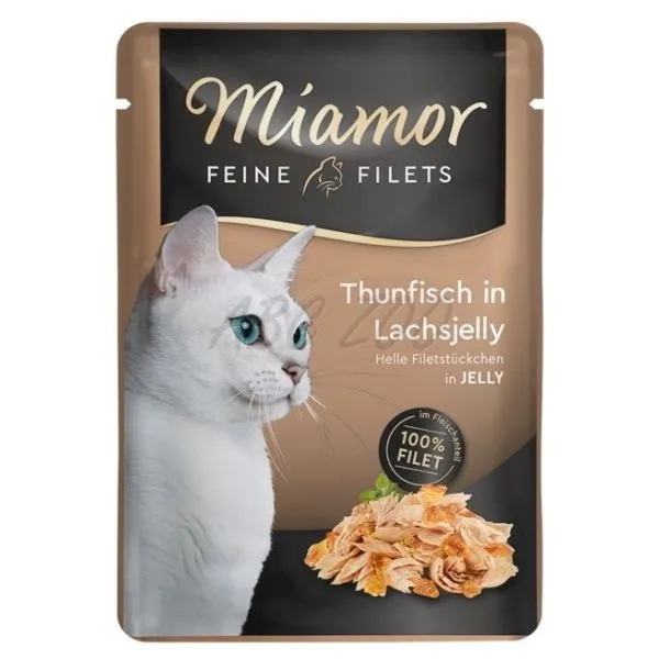 Miamor Feine Filets obsahuje len ľahké filety z tuniaka v lahodnom lososovom želé pre dospelé aj staršie mačky.