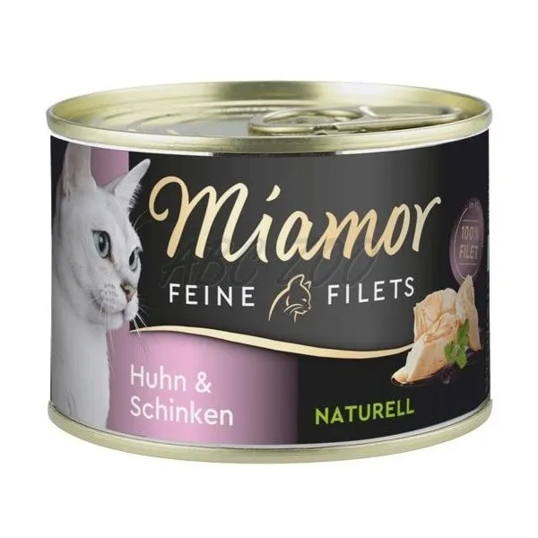 Miamor Feine Filets Naturell obsahuje len ľahké kúsky kuracieho filé vo vlastnej šťave so šunkou pre dospelé aj staršie mačky.