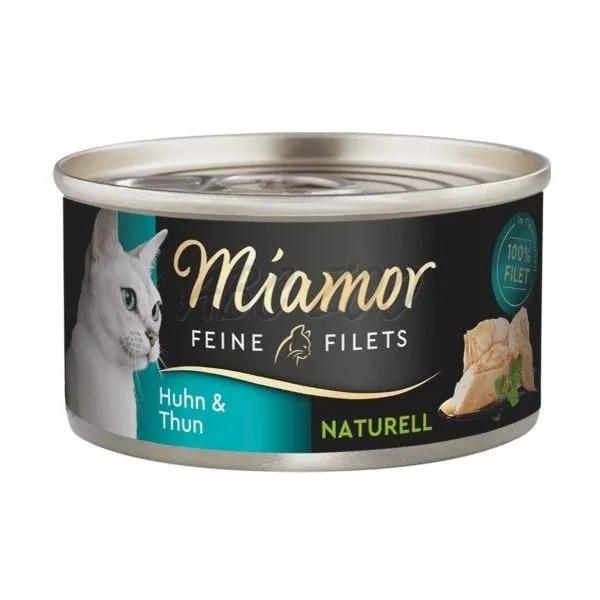 Miamor Feine Filets Naturell obsahuje len ľahké kúsky kuracieho filé vo vlastnej šťave s tuniakom pre dospelé aj staršie mačky.