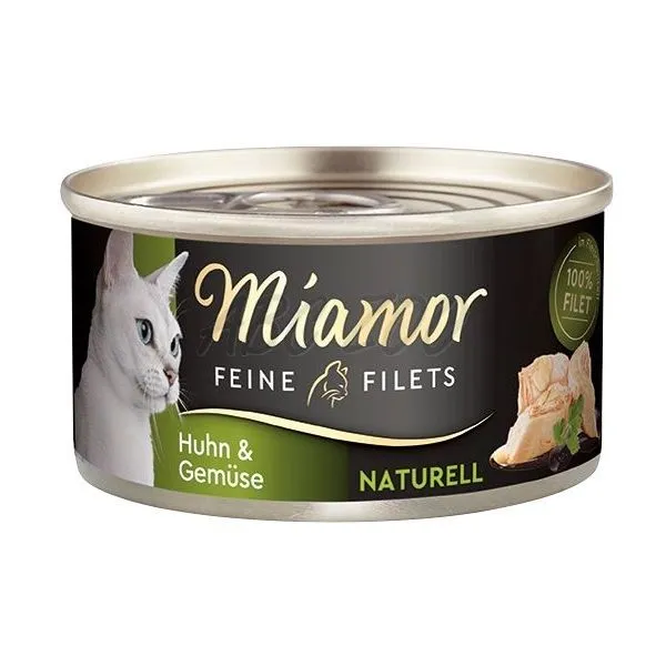 Miamor Feine Filets Naturell obsahuje len ľahké kúsky kuracieho filé vo vlastnej šťave so zeleninou pre dospelé aj staršie mačky.