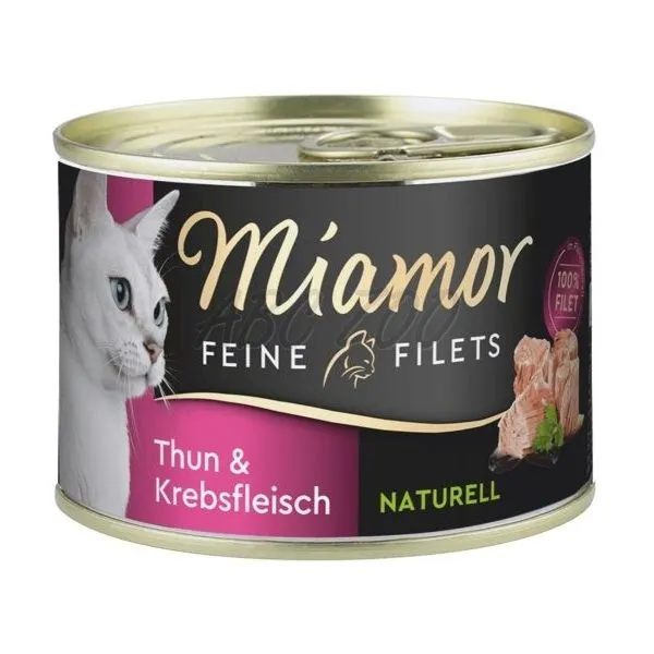 Miamor Feine Filets Naturell obsahuje len ľahké filety z tuniaka vo vlastnej šťave s krabím mäsom pre dospelé aj staršie mačky.
