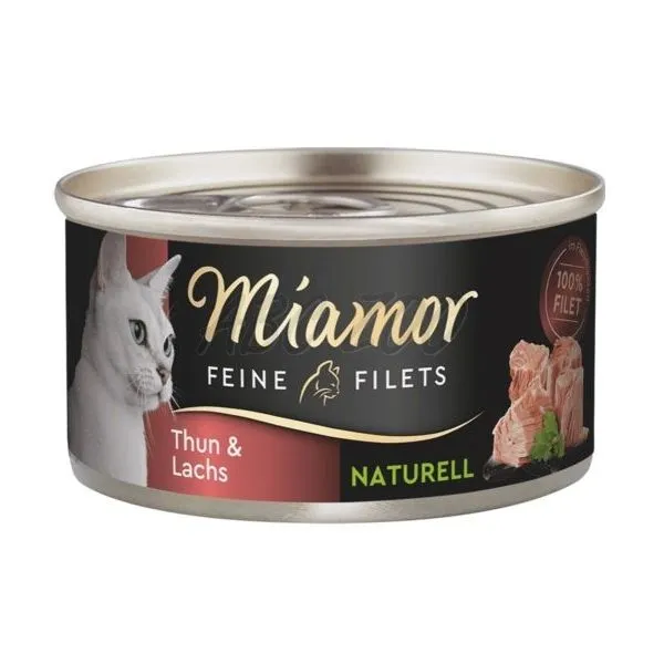 Miamor Feine Filets Naturell obsahuje len ľahké filety z tuniaka vo vlastnej šťave s lososom pre dospelé aj staršie mačky.