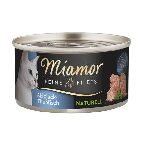 Miamor Feine Filets Naturell obsahuje len ľahké filety z tuniaka vo vlastnej šťave pre dospelé aj staršie mačky.