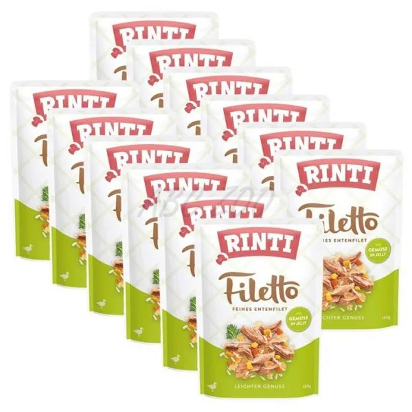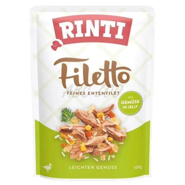 Kapsička RINTI Filetto je doplnkové krmivo pre dospelých psov s kačacím mäsom so zeleninou v jemnom želé.
