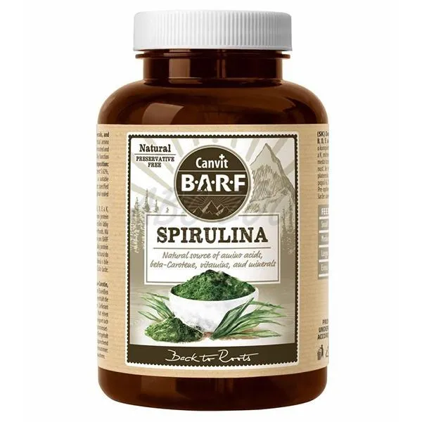 Organická zelenomodrá sladkovodná riasa SPIRULINA je prirodzeným zdrojom bielkovín (60-70%), aminokyselín, minerálnych látok, železa a vitamínov skupín B, D, E, K. Je skvelým zdrojom koncentrovaných a ľahko vstrebateľných živín, vďaka čomu sa radí to kategórie tzv. Superfoods. Tento doplnok v podobe prášku je odporúčaný pri tzv. BARF kŕmení (kŕmenie psa surovou potravou).