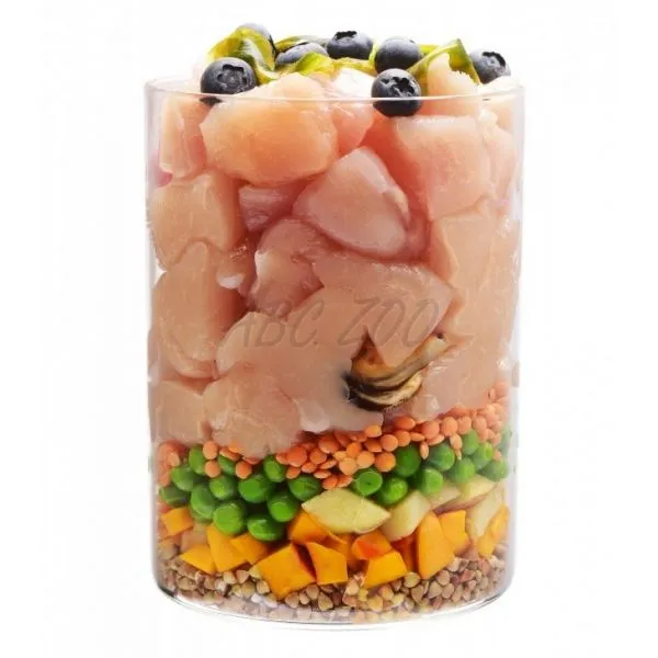 Zloženie: čerstvé kurča (60 %), hrášok, pohánka (6 %), sušené jablká, tekvica (4 %), červená šošovica, kurací tuk (konzervované tokoferoly), lososový olej (2,5 %), prírodné arómy, sušené riasy (Ascophyllum nodosum, 1 %), sušené vaječné škrupiny (0,5 %), proteín zo žaburinky (Lemna) (0,5 %), sušený rakytník rešetliakový (0,2 %), sušený koreň zázvoru (0,1 %), sušené čučoriedky (0,1 %), sušený rozmarín (0,1 %), sušené brusnice (0,1 %), sušený tymián (0,1 %), glukosamín (0,026 %), slávka zelenoústa (0,025 %), chondroitín sulfát (0,016 %), pivovarské kvasnice (zdroj mannan-oligosacharidov, 0,015 %), koreň čakanky (zdroj frukto-oligosacharidov, 0,01 %), juka schidigera (0,01 %)