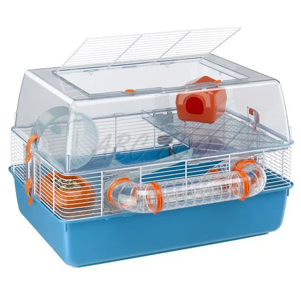 Klietka je rozdelená na tri časti. Spodnú časť tvorí nepriehľadná plastová vanička. Stredná časť je z mreží, cez ktoré prechádza tunel, ktorý vedie z prízemia na prvé poschodie. Vrchnú časť tvorí strieška z priehľadného plastu. Vo vrchnej časti je zabudovaná mreža, ktorá slúži ako dvere pre uľahčenie prístupu do klietky.