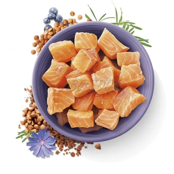 Zloženie: čerstvá ryba (70 %), hrachový proteín, červená šošovica, pohánka (4 %), prírodné arómy, kurací tuk, lososový olej (1 %), chlorid sodný, chlorid draselný, sušené riasy (Ascophyllum nodosum, 0,5 %), proteín zo žaburinky (Lemna) (0,5 %), hrachová múka, sušený rakytník rešetliakový (0,2 %), sušený koreň zázvoru (0,1 %), sušené čučoriedky (0,1 %), sušený rozmarín (0,1 %), sušená kľukva (vaccinium oxycoccos) (0,1 %), sušený tymián (0,1 %), pivovarské kvasnice (zdroj mannan-oligosacharidov, 0,015 %), koreň čakanky (zdroj frukto-oligosacharidov, 0,015 %), juka schidigera (0,008 %)