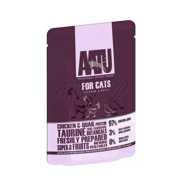 AATU For Cats je superprémiové vlhké krmivo bez obilnín, s kuracím a prepeličím mäsom pre dospelé mačky.