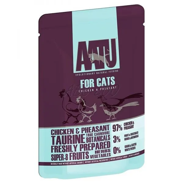 AATU For Cats je superprémiové vlhké krmivo bez obilnín, s kuraťom a bažantom pre dospelé mačky.