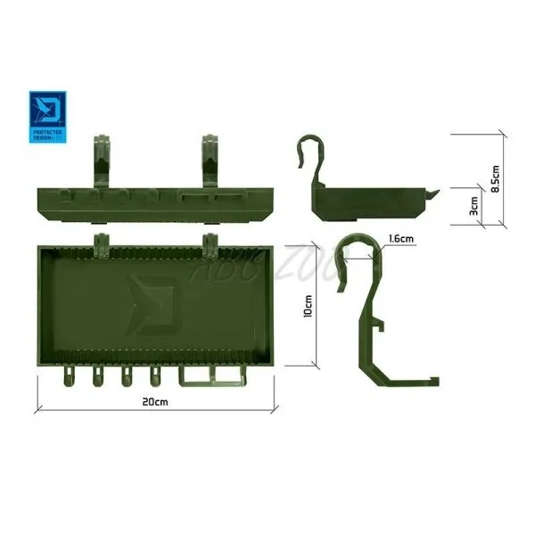 Ďalším doplnkom sú háčiky v prednej časti slúžiace pre zavesenie nadväzcov, prípadne zasunutie ihly, nožníc, alebo inej pomôcky potrebnej počas lovu. Vyberateľné prepážky umožňujú optimalizovať úložný priestor presne podľa vašich predstáv. Polica je navrhnutá v nenápadnom Camo dizajne a tak ľahko splynie s okolitou prírodou.
