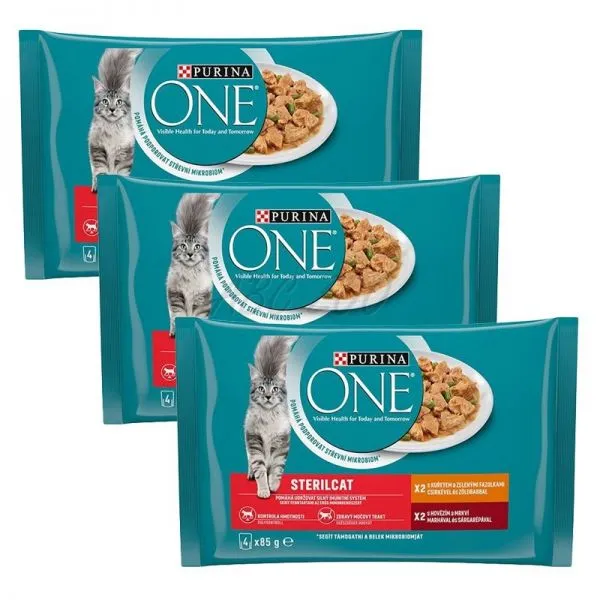 PURINA ONE STERILCAT kapsičky - multibalenie s kuraťom a zelenými fazuľkami v šťave, s hovädzím a mrkvou v šťave.