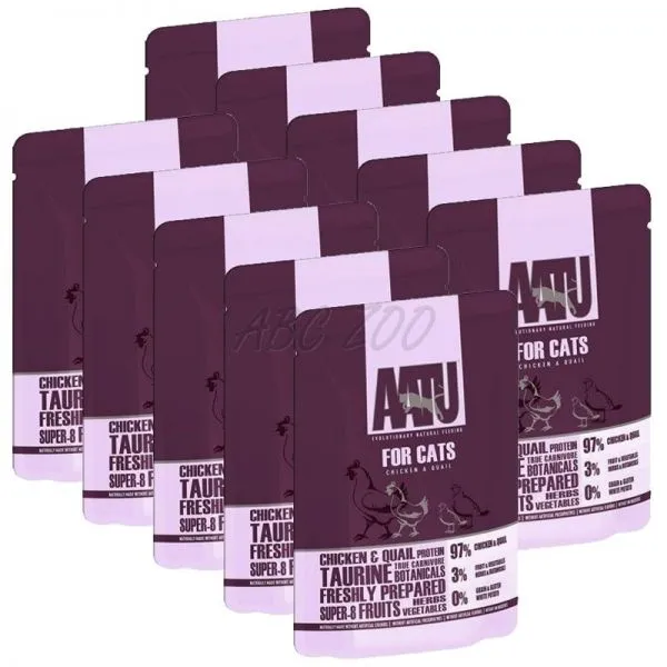 Tieto krmivá bez obilnín, ktoré sa môžu pochváliť pôsobivými 97% ingredienciami živočíšneho pôvodu, môžu byť podávané buď ako kompletné jedlo alebo ako topper so suchým krmivom. Kapsičky AATU tiež obsahujú známu "Super 8" – receptúra ​​na mieru z 8 druhov ovocia, 8 druhov zeleniny, 8 bylín a byliniek poskytuje kombináciu vitamínov a minerálov spolu s neuveriteľnou chuťou.