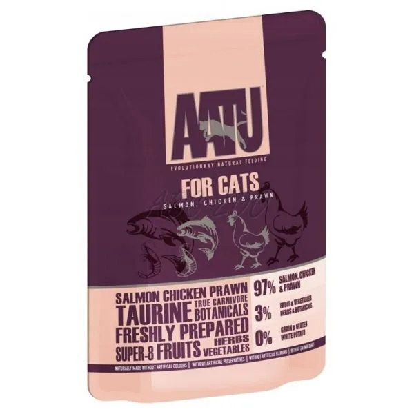 AATU For Cats je superprémiové vlhké krmivo bez obilnín s lososom, kuraťom a krevetami pre dospelé mačky.