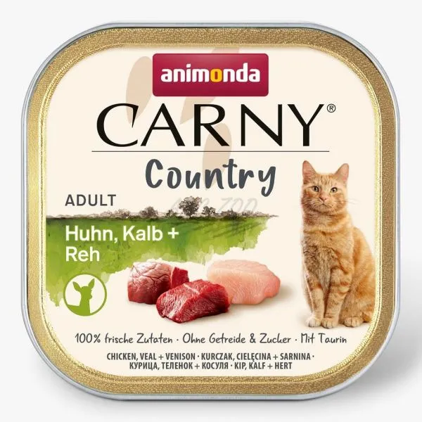 Animonda Country je kompletné vlhké krmivo s kuracím, teľacím a srnčím mäsom, pre dospelé mačky (od 1 do 6 rokov) všetkých plemien.