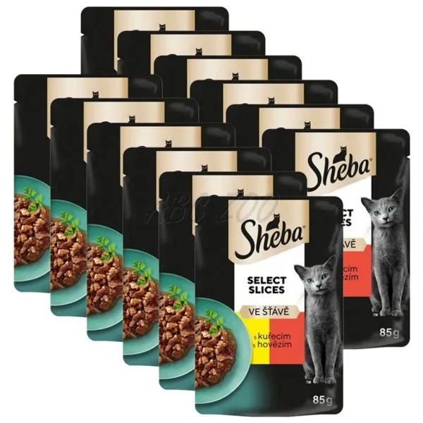 Sheba Select Slices s kúskami šťavnatého kuracieho a hovädzieho mäsa v šťave, pre dospelé mačky.
