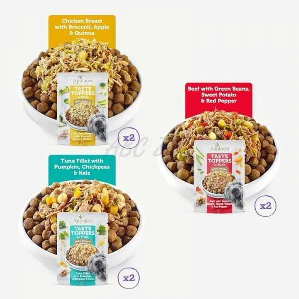 Applaws Dog Taste Toppers in Broth je prémiový multipack kapsičiek s vývarom, ideálny ako topping na suché krmivo alebo samostatná pochúťka pre psov.