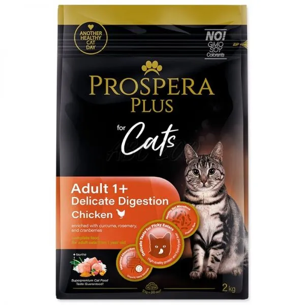 Prospera Plus Adult 1+ Chicken Delicate Digestion je superprémiové suché krmivo pre dospelé mačky, špeciálne navrhnuté na podporu citlivého trávenia a optimálneho zdravia.