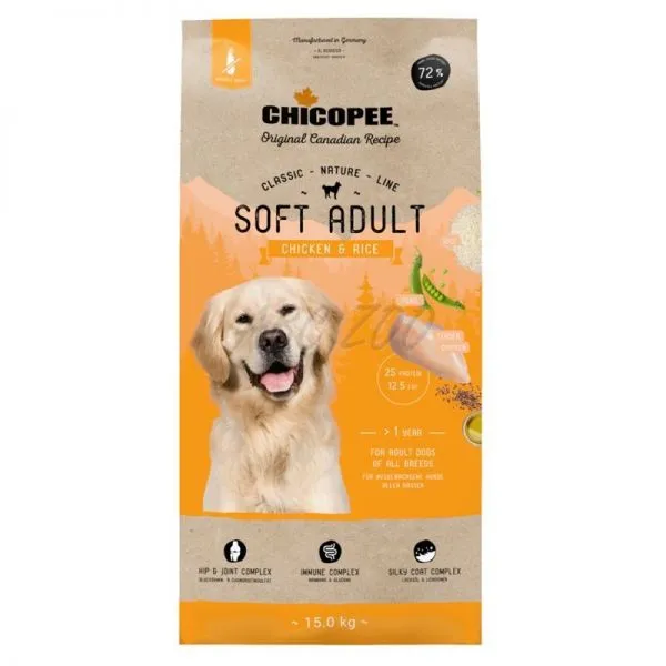 Chicopee Dog Soft Adult Chicken & Rice je kompletné krmivo pre dospelých psov všetkých plemien, s kuracím mäsom a ryžou.