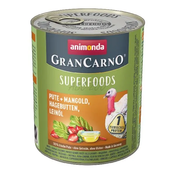 Animonda GranCarno Superfoods je vyvážená konzerva s morčacím mäsom, mangoldom, šípkami a ľanovým olejom pre dospelé psy (1-6 rokov) všetkých plemien.