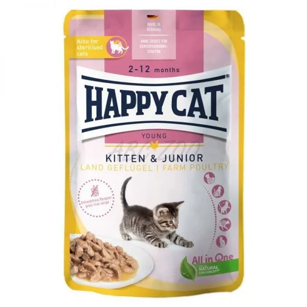Kapsička Happy Cat s krehkými kúskami mäsa z hydiny pre mačiatka od 2-12 mesiacov.