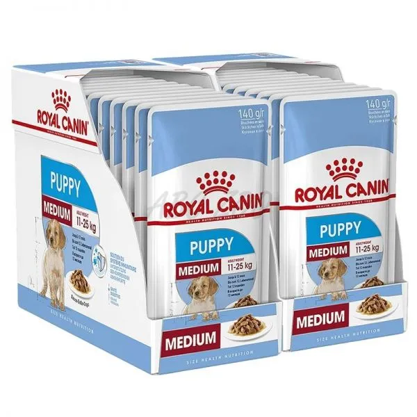 Krmivo ROYAL CANIN® Medium Puppy in Gravy je vytvorené tak, aby uspokojilo všetky nutričné potreby šteniat stredných plemien do 12 mesiacov, ktoré budú mať v dospelosti hmotnosť medzi 11 a 25 kg.