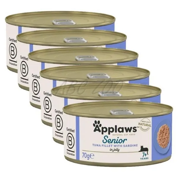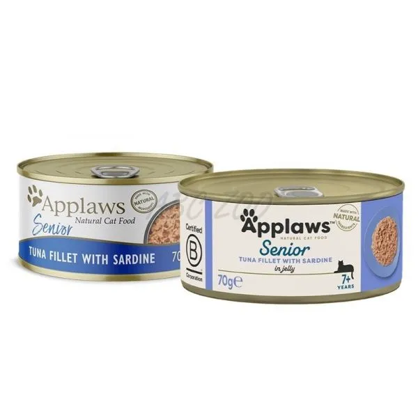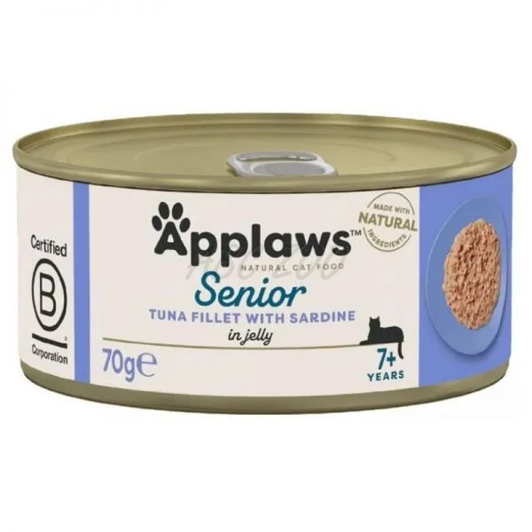 Applaws konzerva pre mačky Senior je prémiové prírodné krmivo špeciálne navrhnuté pre staršie mačky, obsahujúce vysokokvalitné tuniakové filé a sardinky v lahodnom želé.