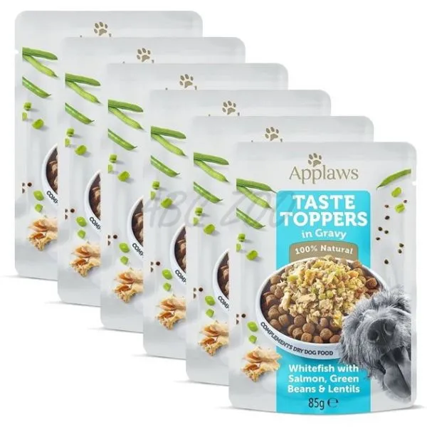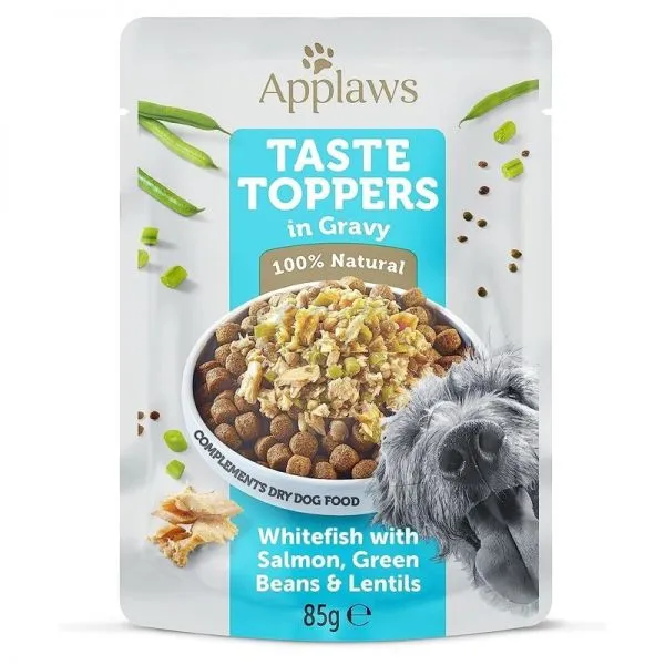 Applaws Dog Taste Toppers in Gravy je prémiové prírodné krmivo v kapsičke pre psov s bielou rybou (síh maréna), lososom, zelenými fazuľkami a šošovicou v lahodnej omáčke.
