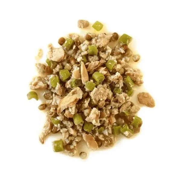 Zloženie: Síh 26 %, losos 14 %, zelené fazuľky 14 %, šošovica 10 %, rastlinné želírovacie činidlo