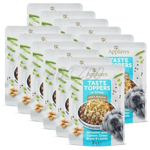 Applaws Dog Taste Toppers in Gravy je prémiové prírodné krmivo v kapsičke pre psov s bielou rybou (síh maréna), lososom, zelenými fazuľkami a šošovicou v lahodnej omáčke.