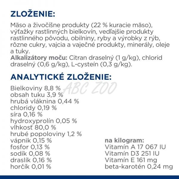 ZLOŽENIE: Mäso a produkty živočíšneho pôvodu (22 % kuracie mäso), výťažky rastlinných bielkovín, deriváty rastlinného pôvodu, obilniny, ryby a výrobky z rýb, rôzne cukry, vajcia a vaječné deriváty, minerály, oleje a tuky. Alkalizátory moču: Citran draselný (1 g/kg), chlorid draselný (0,6 g/kg), L-cysteín (0,3 g/kg).